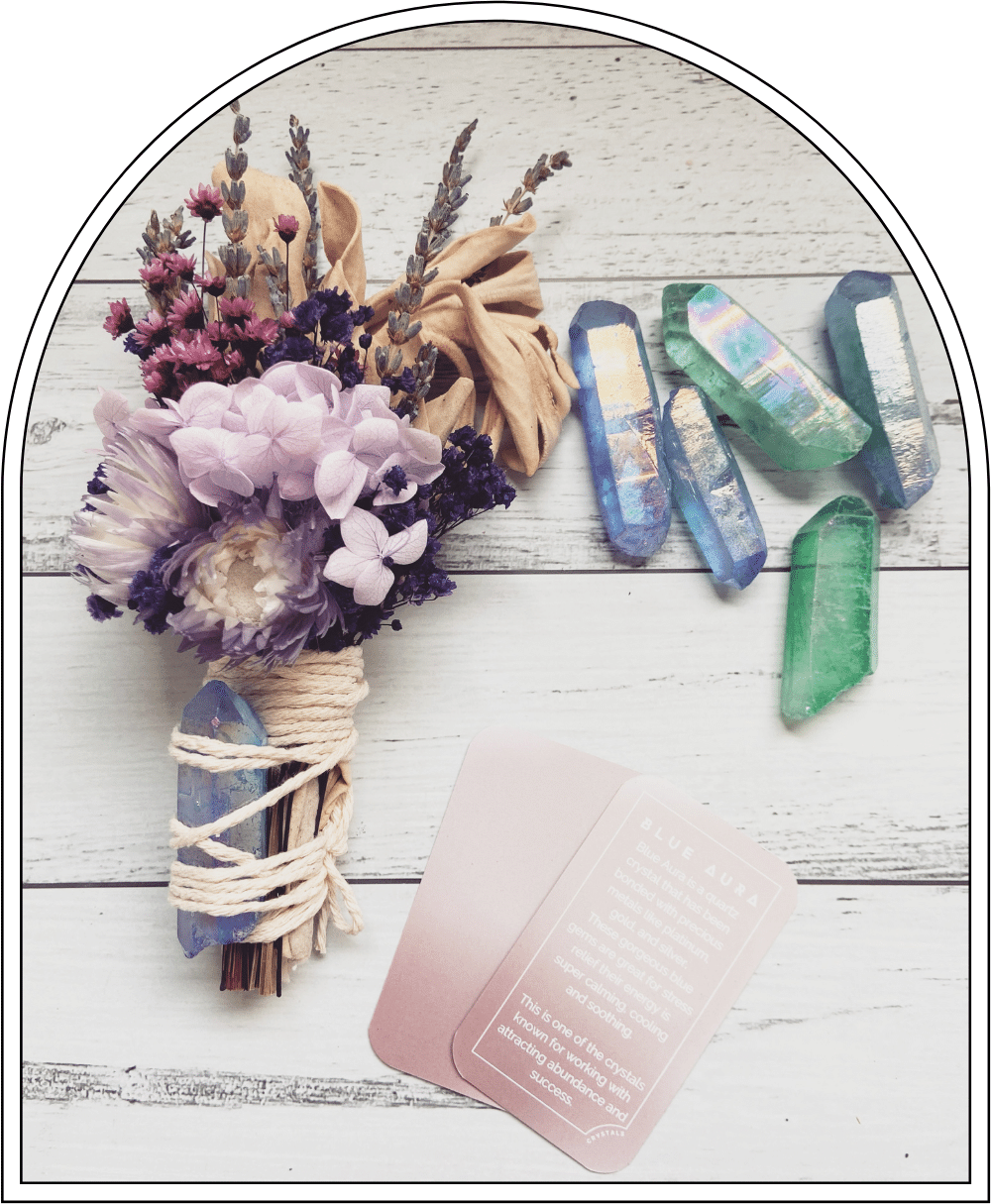 These gorgeous on trend handmade flower wands with blue aura crystal will be a perfect additional to your gifting experience. Blue Aura is a quartz crystal that has been bonded with precious metals like platinum, gold, and silver which gives it an iridescent glow. These gorgeous blue gems are great for stress relief their energy is super calming, cooling and soothing. The flower wands are not designed for burning or smudging but to be kept in area of your home or office space. Your flower wand comes with a cute unbranded blue aura crystal meaning card and is made out of dried lavender so they smell amazing too!